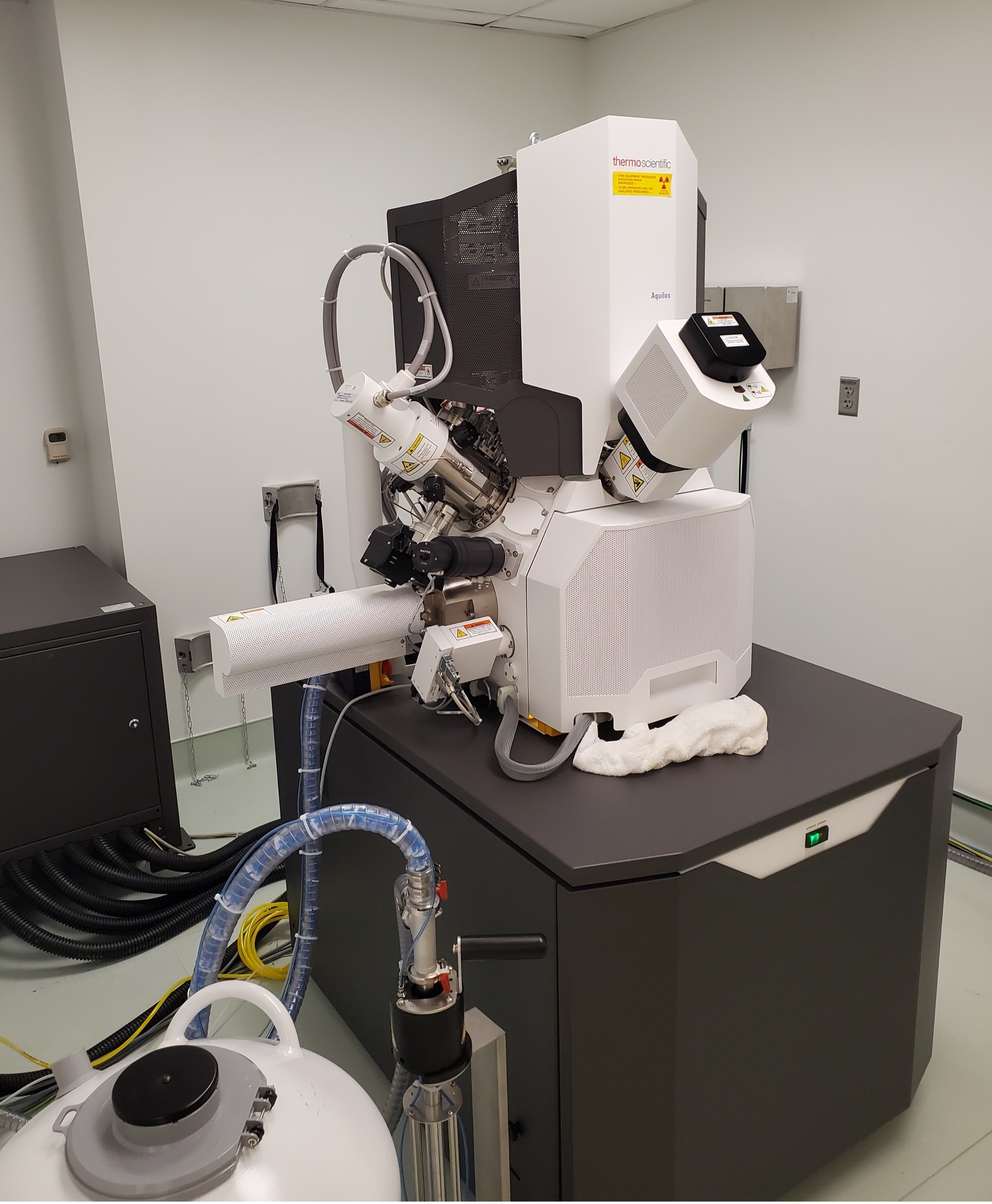 Rutgers was the first site on the continent to receive a ThermoFisher Aquilos 2 cryoFIB/SEM. This gallium focused ion beam instrument is designed specifically for operations with cells in amorphous ice. The Aquilos 2 includes in-chamber Magnetron sputter-coater, organoplatinum gas injection system, two in-chamber and two in-column detectors, and endless 360°+ rotation. The EasyLift nanomanipulator is designed for lift-out operations. Both parallel on-grid lamella milling and serial-section imaging are facilitated with automation software. The most common use of this instrument is cutting <200nm-thick lamellae to prepare cell interior for cryo-electron tomography in the Talos Arctica cryoTEM.